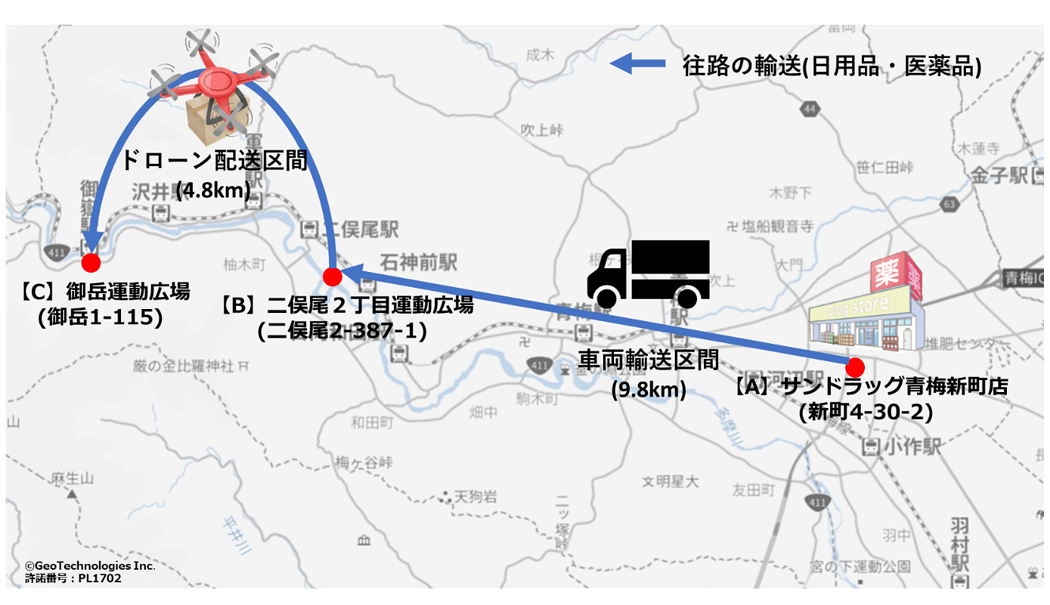 PC、スマホ、またはお電話にて注文いただいた商品(日用品、市販医薬品、食品など)を、青梅市二俣尾2丁目運動広場、御岳運動広場まで配送します。また、期間中、地域の小学校において、児童を対象としたドローン物流に関する教室も開催する予定です。